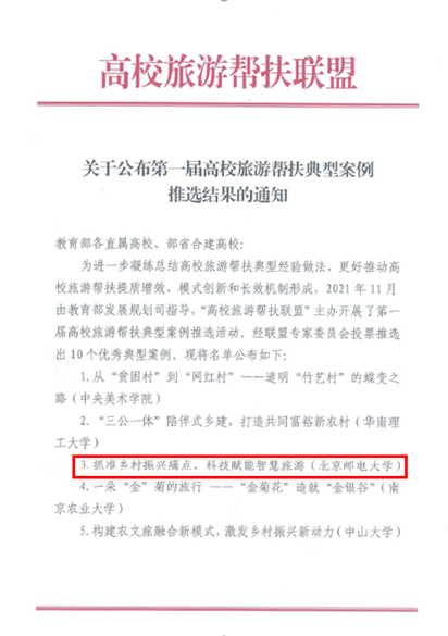 近日,为进一步推进巩固拓展脱贫攻坚成果同乡村振兴有效衔接,凝练总结高校旅游帮扶典型经验做法,根据教育部工作部署,“高校旅游帮扶联盟”开展了第一届高校旅游帮扶典型案例推选活动。依托我校作为“高校旅游帮扶联盟”成员单位,365官网组织申报了《抓准乡村振兴痛点 科技赋能智慧旅游》项目,经联盟专家委员会评审,项目入选第一届高校旅游帮扶优秀典型案例。