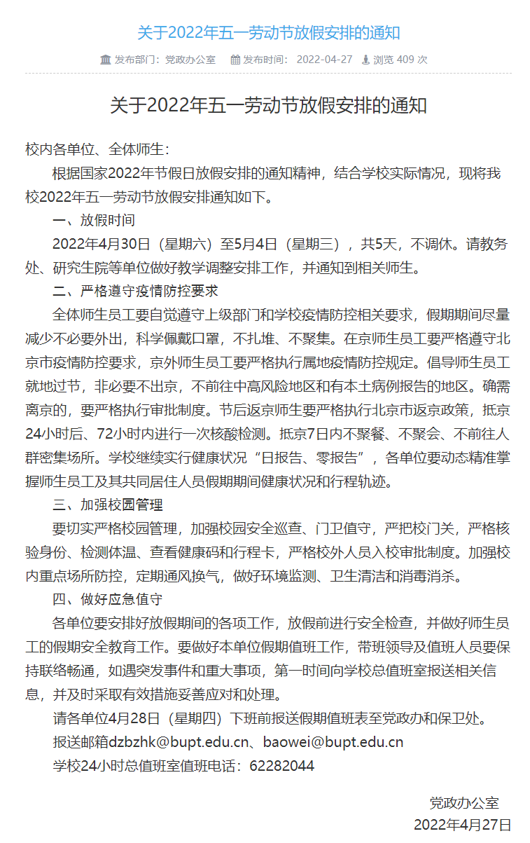 关于2022年五一劳动节放假安排的通知